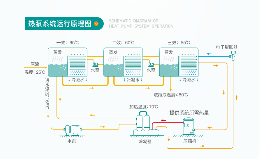 设备依托除湿热泵技术实现能量高效利用与转换,在真空负压作用下,原液可在低温环境下沸腾蒸发,从源头减少能耗。同时,热泵系统通过压缩机热源加热、冷量冷凝的热回收机制,极大提升能源利用率,1KW 电能可撬动 7KW 热量用于蒸发,节能效果十分显著。